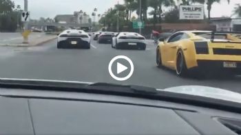 Ούτε μία, ούτε δύο, αλλά 7 Lamborghini-«συμμορίτες» κινούνται σε σφιχτό κλοιό με τους κινητήρες και τις εξατμίσεις τους να συνθέτουν μια μοναδική... μελωδία. Που πάει η δόλια Porsche να μπλέξει με τους... ταύρους κάνοντας κατεβάσματα δίπλα τους;