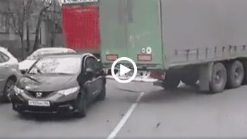 Η νταλίκα παίρνει τη στροφή και η δοκός-«προφυλακτήρας» μπαίνει στο θόλο του Honda Civic. Κυριολεκτικά το παίρνει και το σέρνει από το θόλο. Δείτε το απίστευτο video.