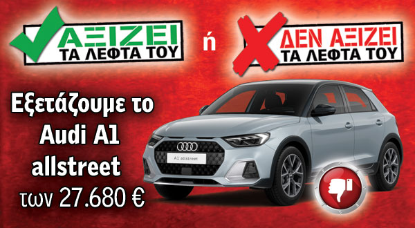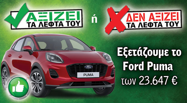 | | | | | | |  | Toyota Yaris Hybrid 130: Καίει 3,4 λτ/100 χλμ στην πόλη | Έχει τη χαμηλότερη κατανάλωση στην πόλη στην κατηγορία. Έχει καλά φρένα και προσπερνάει γρήγορα. Πλέον έρχεται με 11 χρόνια εγγύηση, πίσω θα χωρέσουν ενήλικες ύψους 1,80 μ. Παρά την «αλμυρή» τιμή, έχει πλούσιο βασικό εξοπλισμό. | Read  | | |  | Εξετάζουμε το Ford Puma των 23.647 ευρώ | Έχει εξαιρετική οδηγική συμπεριφορά και καλά φρένα (100-0 σε 37,2 μ.) Πετυχαίνει την χαμηλότερη κατανάλωση σε ταξίδι (4,2 λτ./100 χλμ.), κάνει 1.000 χλμ. με ένα γέμισμα. Διαθέτει το μεγαλύτερο πορτμπαγκάζ της κατηγορίας (536 λτ.) και πλούσιο εξοπλισμό από την βασική. Καλύπτεται από 8-ετή εγγύηση, μία από τις μεγαλύτερες στην αγορά. | Read  | | |  | Εξετάζουμε το Audi A1 allstreet των 27.680 ευρώ | Είναι ακριβό, θες 27.680 ευρώ για τη βασική έκδοση των 116 ίππων. Ελλείψεις σε εξοπλισμό: Δεν έχει camera όπισθεν, ούτε LED φανάρια, ούτε keyless σύστημα. Έχει στενό πίσω κάθισμα και το μικρότερο χώρο για τα κεφάλια των πίσω στην κατηγορία. Το πορτ-μπαγκάζ είναι μικρό (335 λίτρα). | Read  | | | | | |