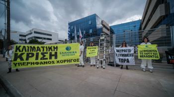 Ενώ η δράση στη διυλιστήρια Ασπροπύργου συνεχίζεται, δεύτερη ομάδα ακτιβιστών διαμαρτύρεται στα κεντρικά των ΕΛΠΕ στο Μαρούσι συνεχίζοντας την ειρηνική διαμαρτυρία ενάντια στις εξορύξεις υδρογονανθράκων. Μαζί τους μέλη τοπικών κοινωνιών.