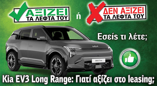 | | | | | | | | | |  | Hyundai Tucson 1,6D: Τετρακίνητο diesel που καίει 7,5 λτ/100 χλμ | Έχει χώρους για 5 ψηλούς επιβάτες και 5 μεγάλες βαλίτσες στο πορτ-μπαγκάζ. Τα φρένα του είναι από τα κορυφαία της κατηγορίας. Καίει 7,5 λτ/100 χλμ σε μικτό κύκλο, 6 στο ταξίδι και 8,2 στην πόλη. Είναι «τσιμπημένο» σε τιμή, όμως έχει υπερ-πλούσιο εξοπλισμό και τετρακίνηση. | Read  | | |  | Renault 5 E-TECH Electric 120 PS: Vintage σαν να'ταν 70s! | Το θρυλικό «Πεντάρι» επέστρεψε σαν ηλεκτρικό, με ξεχωριστό retro design. Στο πίσω κάθισμα του Renault 5 E-TECH Electric θα κάτσουν 2 ενήλικες με ύψος 1,83 μέτρα. Το Renault 5 E-TECH Electric κάνει 381 χλμ στην πόλη με 1 φόρτιση (238 στο ταξίδι). Έχει υψηλή ποιότητα κύλισης και γίνεται σπορτίφ όταν του το ζητήσεις. | Read  | | |  | Opel Grandland 145 PS VS Skoda Karoq 150 PS | Έχουν αντίστοιχη τιμή, όμως το Opel είναι ήπια υβριδικό κι έχει 1 χρόνο παραπάνω εγγύηση. Το Grandland καίει λιγότερο στην πόλη (7λτ./100 χλμ.), όμως το Karoq είναι γρηγορότερο. Το Opel έχει καλύτερους χώρους στην καμπίνα και λίγο μεγαλύτερο πορτμπαγκάζ (550 λτ.). Στις βασικές εκδόσεις, keyless entry το Grandland και κάμερα οπισθοπορείας το Karoq. | Read  | | |  | Kia EV3 Long Range: Γιατί αξίζει στο leasing; | Μισθώνεις στο 75% της αξίας του, γλιτώνεις 9.000 ευρώ από το να το αγόραζες. Έχει φουτουριστική αισθητική και την μεγαλύτερη αυτονομία στην κατηγορία του (700+ χλμ. στην πόλη). Είναι «σβέλτο» και ευέλικτο στην πόλη (0-100 σε 7,8 δλ.) με ικανοποιητικούς χώρους (460 λτ. πορτμπαγκάζ). Η καμπίνα του έχει τεχνολογικό χαρακτήρα και ο εξοπλισμός άνεσης και ασφάλειας είναι πλήρης από την βασική. | Read  | | | | | | |